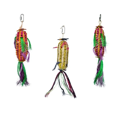De Back Zoo Nature Melon Pinata is een kleurrijk, handgemaakt vogelspeeltje dat uitnodigt tot knabbelen, slopen en ontdekken. Het ontwerp biedt ruimte om snacks of voeding te verstoppen en sluit daarmee aan bij het natuurlijke foerageergedrag van vogels. De pinata is gemaakt van natuurlijke materialen zoals palmbladeren, vezelbanaan (abaca) en buri en is eenvoudig op te hangen in het vogelverblijf. Omdat elk speeltje met de hand wordt vervaardigd, is ieder exemplaar uniek in vorm en uitstraling.