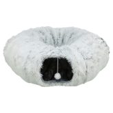 De Trixie Harvey Pluche Speeltunnel/Donut Wit/Grijs is een veelzijdige en zachte speeltunnel die zorgt voor uren speelplezier én ontspanning. Dankzij de handige drukknoopsluiting kan de tunnel worden omgevormd tot een donutvormige ligplek of een S-vormige speeltunnel. De tunnel heeft vier ingangen en is bekleed met heerlijk zacht velours/pluche, waardoor katten er niet alleen doorheen willen rennen, maar ook graag op uitrusten. Het bungelende speeltje aan een koord zorgt voor extra uitdaging en activiteit.
